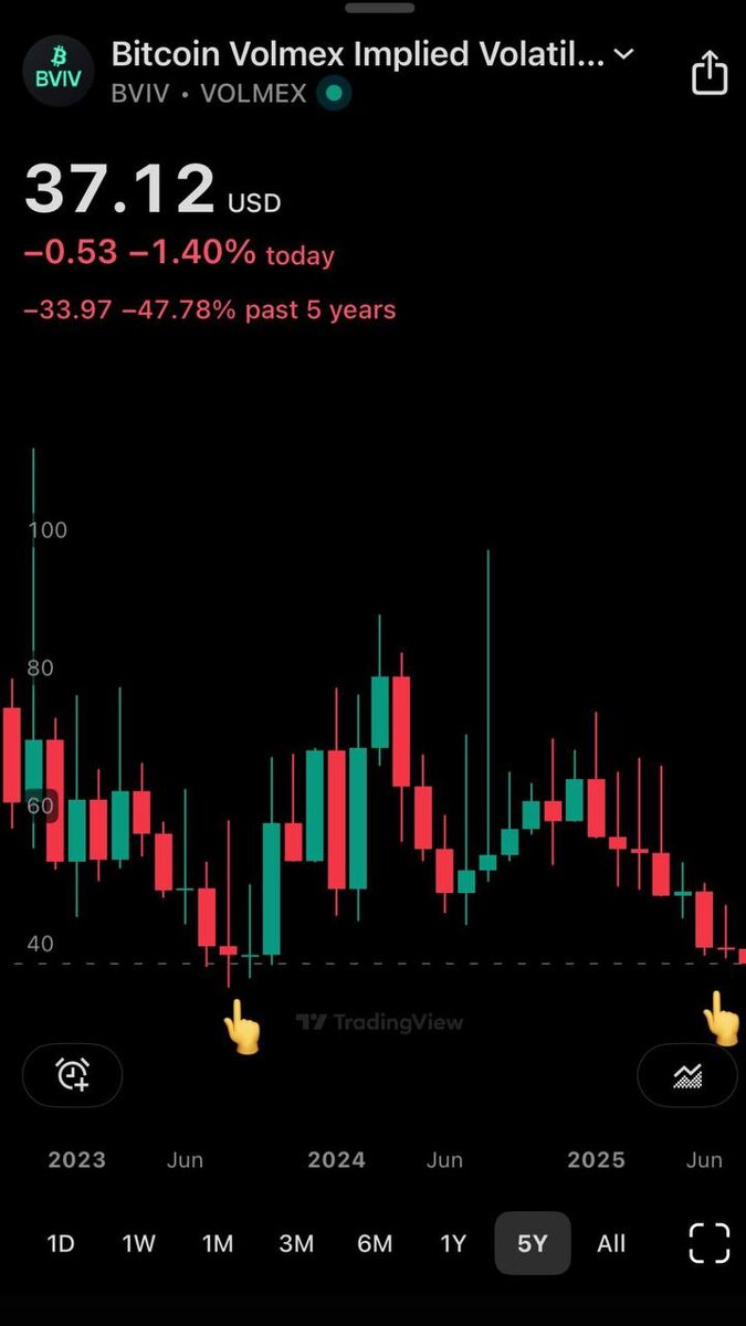 Имплайд вола в биткоине — на минимуме за 2 года. Что было в прошлый раз? Вот вам простая картинка, которую можно распечатать и повесить над кроватью, если вы торгуете фьючами. IV (имплайд волатильность) сейчас на уровне 37.12 — почти в точке августа 2023. Тогда вола не просто выросла — рынок разнесло. Потому что низкая волатильность долго не живёт. Она накапливается, чтобы потом взорваться. Это не supply shock. Это short squeeze waiting to happen. Низкая вола — это как спичка в бензобаке: в моменте ничего, но потом… На что стоит обратить внимание: 1. Рынок залип в узком диапазоне, все ждут движения. 2. IV на минимуме, рынок «уснул» → следующее движение будет агрессивным. 3. Приоритет? Сильнее всего страдают те, кто ставит против тренда. А если большинство сидит в шортах — угадайте, кто улетит? К чему всё идёт? Если у вас боты — готовьтесь к импульсу. Если вы в позиции — держите её с планом. Если вы ждёте — не проспите момент, когда будет поздно входить. Хотите сделаю разбор