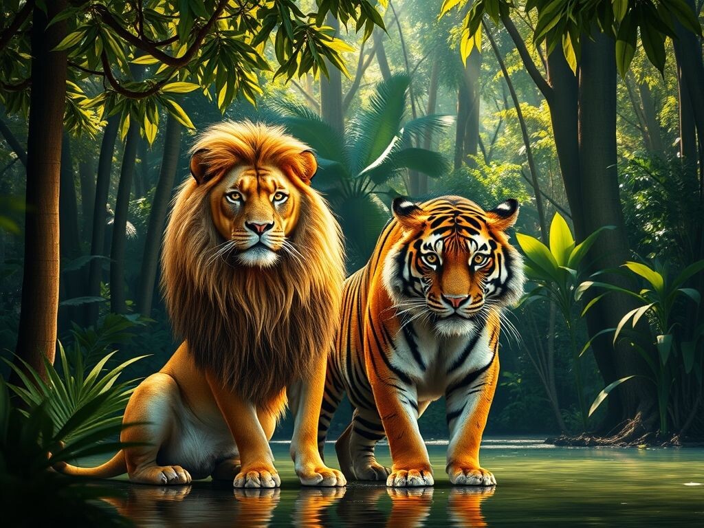 Лев и тигр - великолепные, но совершенно разные вершины кошачьей эволюции, адаптированные к разным средам и образу жизни. Их "соперничество" - это в большей степени продукт человеческого любопытства, мифологии и жестокости (бои в неволе, гибридизация), чем реальность дикой природы. В естественных условиях они практически не встречаются и не конкурируют. Настоящие враги и конкуренты у них другие: гиены, леопарды, медведи (для тигров), другие прайды львов, браконьеры и разрушение среды обитания - для обоих видов.