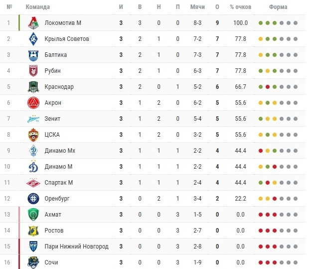 Приветствую, Вас, уважаемые читатели! В Российской Премьер-Лиги сыграно уже 3 матча. Пройдено 10% пути. Голов было забито 24 в 8 матчах-это средний показатель, то есть голов не так много, но и далеко не мало. Для начала обратимся к турнирной таблице прежде, чем приступить к прогнозам. В прошлом туре мне удалось угадать 5 результатов из 8 матчей. Неплохой показатель, могло быть и больше, так как колебался в калининградском матче (ничья или победа Балтики) и надо было ставить на победу Балтики, да и Краснодар дожал Динамо только в концовке матча, а я предполагал ничью. С точки зрения турнирной таблицы, то центральным матчем 4 тура будет игра Крылья Советов-Балтика. Обе команды одержали 2 победы и 1 раз сыграли вничью. Забили по 7 голов, единственное только "крылышки" пропустили на 1 мяч меньше. Предположу, что Крылья Советов победит за счёт домашнего поля и поддержки трибун. Также интересный матч ожидается в Москве. Будет очередное московское дерби Локомотива и Спартака. Здесь я склоняю