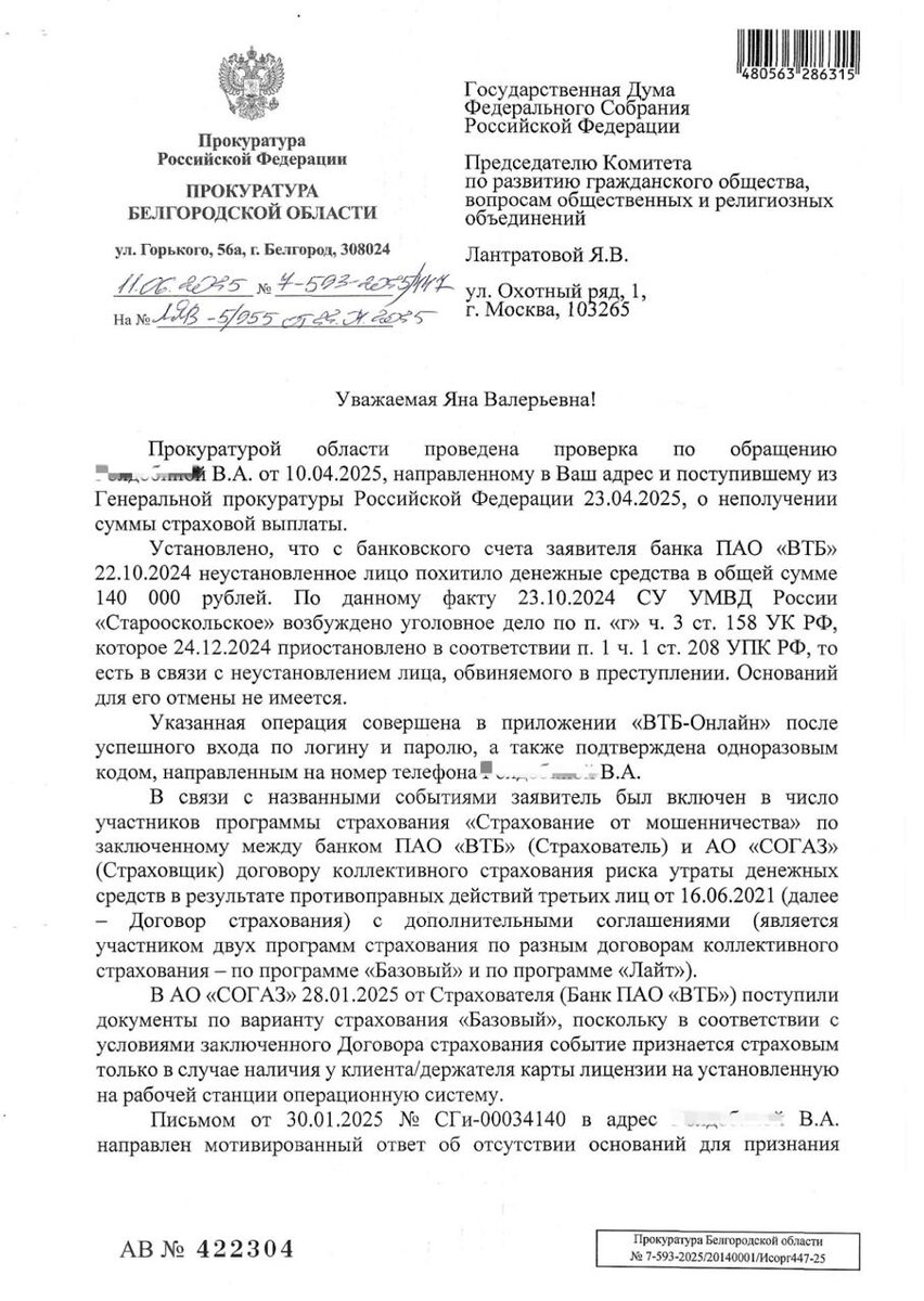 После моего обращения в прокуратуру жительнице Белгородской области, ставшей жертвой мошенников, по страховке возместили утраченные средства