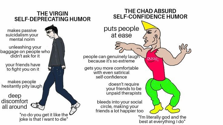 💪Chad vs. Virgin - классика мемов: противопоставление уверенного красавчика и неуверенного неудачника.