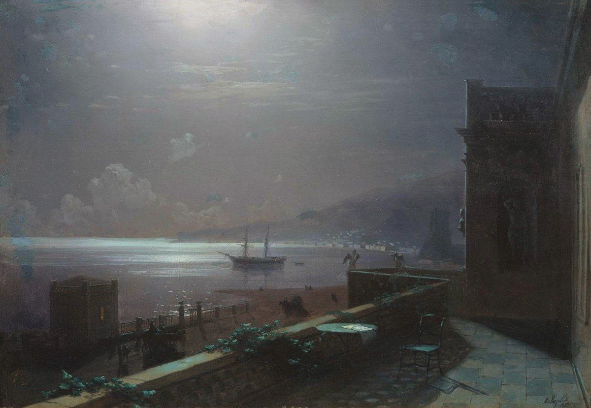 Айвазовский Иван Константинович, (1817–1900) Феодосия в лунную ночь. Вид с балкона дома Айвазовского на море и город. 1880. Холст, масло, 44 х 64 см Из фондов: Государственный художественный музей Алтайского края. #живопись #искусство #графика #Айвазовский #Феодосия