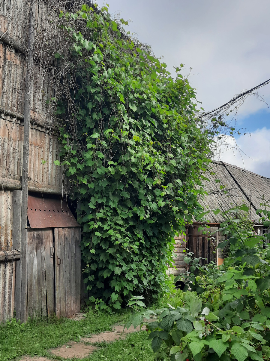 Но пройти мимо маминой лианы я уже не могла. Вот она, мама моих лиан в прямом и переносном смысле. Это ее скромное состояние, потому как временами она разбегалась по всем проводам, свисала красивыми плетями. Я тихо восхищлась, прохожие громко. Так что, заведя сад, я нарезала черенков и посадила у себя. Мама уверяла, что у нее не получалось, хотя она в этом деле преуспела. А у меня прижились все четыре! Сначала я посадила их парами у стенки, однако плети на стенку не полезли, а полезли на яблони. Промучавшись пару сезонов, я их пересадила. Один к бане. Ему там понравилось, он прекрасно разрастается. даже каприфоль выжил. Я о ней уже и вспоминать перестала. Мне очень хотелось, чтобы этот виноград распростер свои длани по крыше, по забору. Но у него завелся враг! Мой муж стал резать все безбожно, оставляя только небольшие плети. Нынче болел чем-то. Или тля расплодилась? Раньш не замечала. Обрабатывала, вроде стало лучше. Это какой-то амурский виноград, но не совсем амурский, гибрид