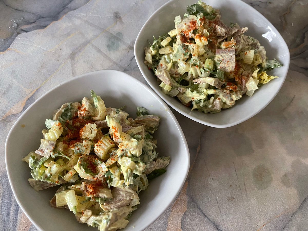 Приготовление : Для соуса чеснок измельчить . Смешать майонез с йогуртом, чесноком, порошком карри. При желании посолить. Закрыть и поставить в холодильник до подачи. Куриное филе залить водой и варить после закипания на маленьком огне под закрытой крышкой 15 минут. Снять с огня и оставить остывать в бульоне под крышкой не меньше 30 минут. Затем вынуть филе из бульона и нарезать тонкими ломтиками. Если у сельдерея есть жесткие волокна, удалите их. Нарезать черешки тонкими ломтиками . Смешать сельдерей с курицей и кинзой, заправить соусом и посыпать паприкой. И можно подавать . Приятного аппетита !