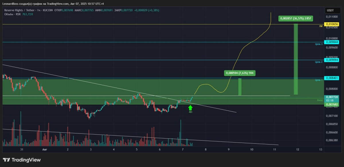#RSR 🔼🔼🔼 ⚠️Еще один претендент на сделку внутри дня, а также среднесрок. Открываемся только по выходу и закрепу 1Н ТФ над указанным уровнем, по сути над ценой 0,0078$. 1я цель для быстрой маржинальной сделки, поскольку именно от этой зоны цену могут вернуть на ретест блока. Среднесрочные цели 2х недель выше на графике!!!