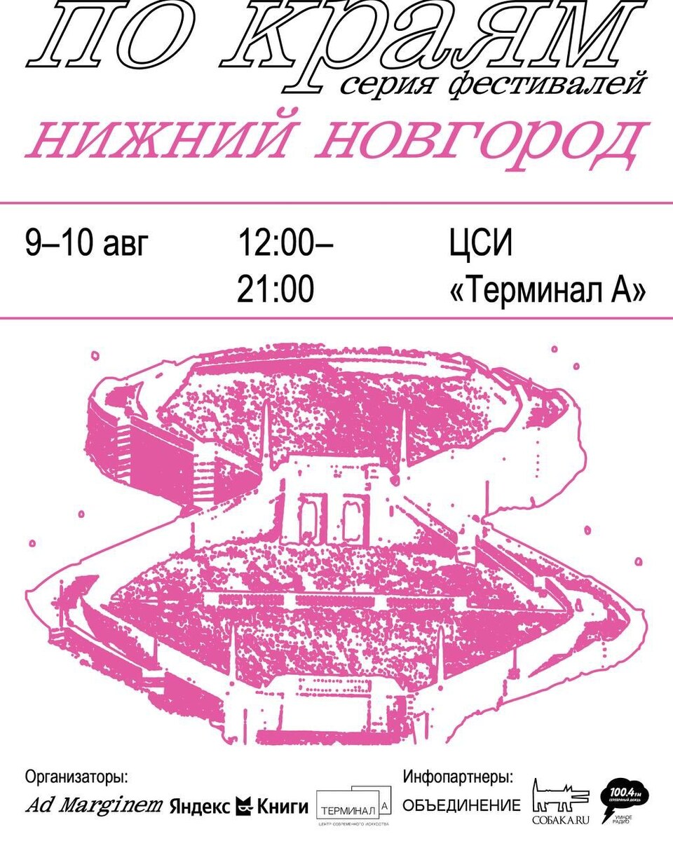 Книжный тур издательства Ad Marginem «по краям» — в Нижнем Новгороде! 9 и 10 августа пройдет книжный фестиваль в Нижнем Новгороде в рамках тура «по краям» при поддержке «Яндекс Книг». В программе — распродажа книг Ad Marginem, лекции, дискуссии, мастер-классы, — а еще книжный и музыкальный своп от книжного проекта «неработа» и лотерея с призами от Ad Marginem, А+А, SALUT!, «Яндекс Книг» и «Чихо»! Среди участников события — философы, культурологи, историки, исследователи, кураторы, художники и редакторы книг Ad Marginem, а также локальные проекты. Соорганизатор события — Центр современного искусства «Терминал А». О программе события подробнее — в карточках и на сайте тура. Вход на все события свободный.