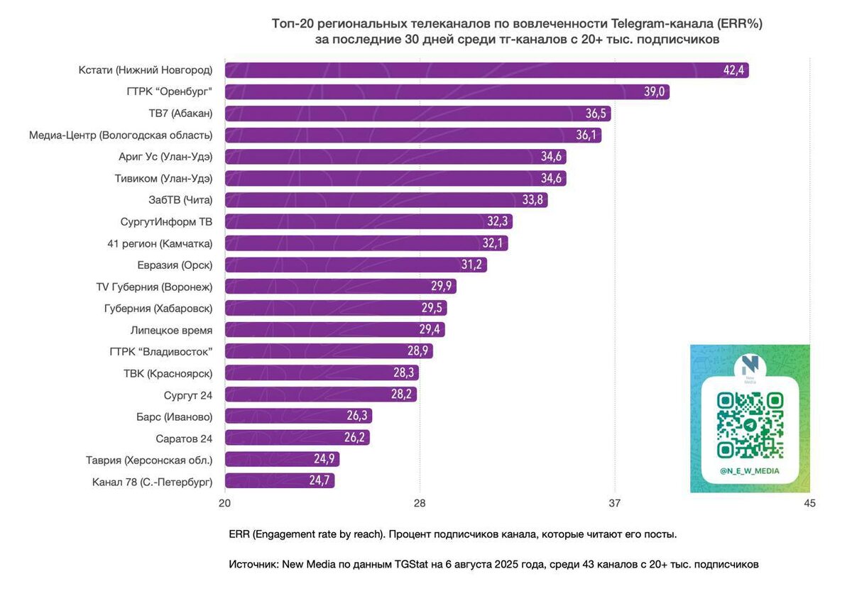 ⚡️Телеграм-канал «Липецкое время» вошёл в Топ-20 региональных телеканалов в Telegram — по итогам последних 30 дней его отметили в рейтинге среди каналов с аудиторией свыше 20 тысяч подписчиков, составленном аналитиками New Media. 📈 Особенно высокую позицию канал занял по динамике роста охвата: в сравнении июля с июнем «Липецкое время» вошло в топ-5 телеканалов России: 1️⃣ 41 регион (Камчатка) +72% 2️⃣ ГТРК «Сочи» +45% 3️⃣ ТВ7 (Абакан) +32% 4️⃣ «Кстати» (Нижний Новгород) +24% 5️⃣ Липецкое время +24% Рост охвата — показатель интереса и доверия аудитории. Спасибо всем вам!❣️