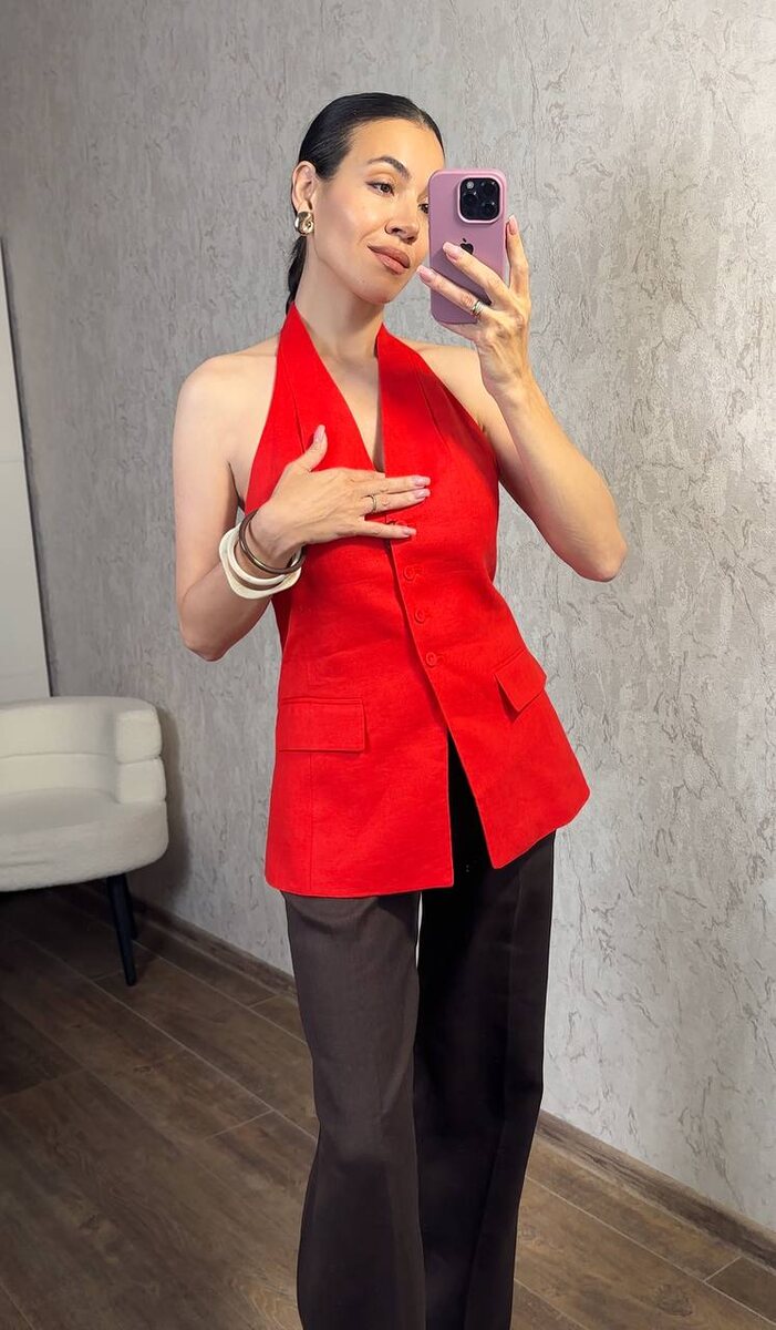 Красный жилет из 100% хлопка в костюмном стиле с воротником халтер. Прекрасно садится по фигуре за счет вытачек на груди, смотрится дорого, как и стоимость до распродажи. Жилет совершенно не просвечивает, не колючий, мнется как все льняные изделия.