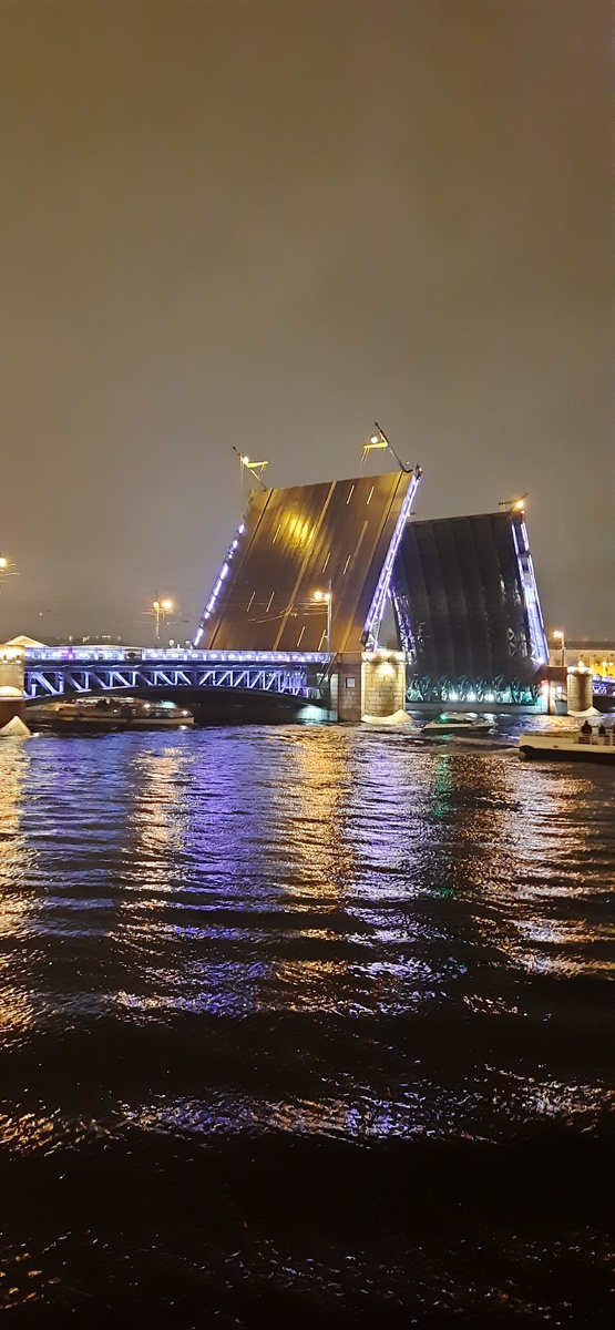 Это был конец октября 2022 года, осенние каникулы в школе, отпуск на работе. Было принято решение лететь в Питер на 4 дня. В Питере мы ни разу не были, маршрут на каждый день разрабатывали сами. Первый день прогулок у нас начался в час ночи. Мы прилетели поздно, заселились в гостиницу на Фонтанке и решили сходить сразу на разведение мостов. От гостиницы идти до Дворцового моста около 30 минут. Шёл небольшой дождь, но было очень тепло. Думали людей будет мало, вроде не сезон - не тут-то было. Несмотря на народ, места хватило всем и полюбоваться, и пофотографироваться. Дворцовый мост разводят первым из всех мостов примерно в 01-30. Он расположен между Дворцовой площадью и стрелкой Васильевского острова. Очень завораживающее зрелище. Далее мы отправились спать, чтобы утром продолжить наши прогулки. Утро было дождливое, но теплое Первым делом мы решили отправиться на Петровскую и Петроградскую набережную. Там погуляли и дошли до крейсера "Аврора". История крейсера знакома, наверное, мног