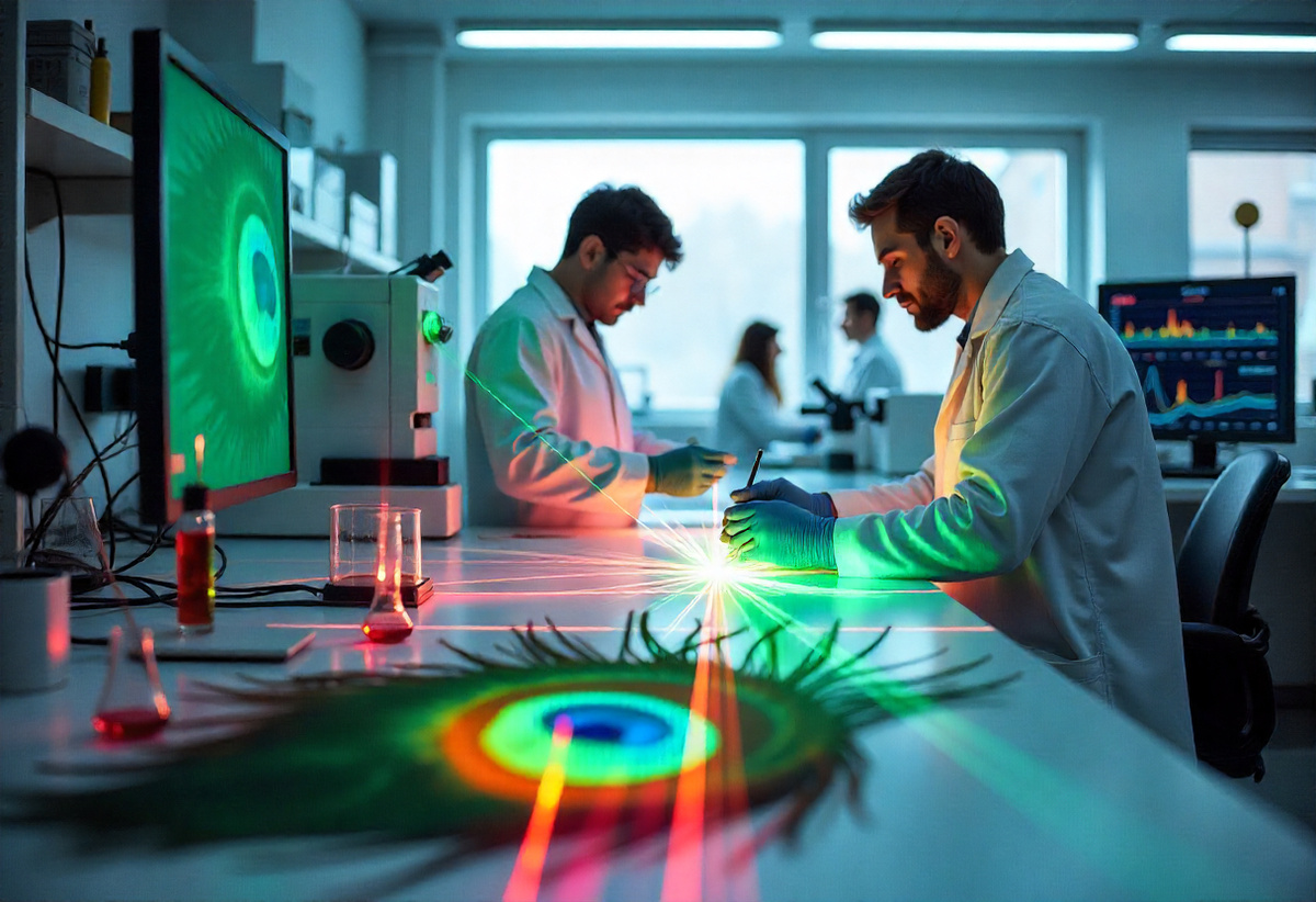 Новое исследование ученых из нескольких американских университетов пролило свет на удивительное свойство хвостовых перьев павлинов: их способность действовать как крошечные лазерные резонаторы при введении обычного флуоресцентного красителя. Специалисты изучали поведение барбул павлиньих перьев — микроскопических структур, которые помогают создавать знаменитые мерцающие глазки птицы — при обработке лазерным красителем. Область «глазков» аккуратно вырезали и несколько раз смачивали специальным раствором с родамином 6G. Этот краситель хорошо известен своей яркой флуоресценцией при воздействии зеленого лазерного света. Используя импульсы зеленого лазера, команда освещала подготовленные перья и собирала излучаемый свет с помощью специальной спектрометрической системы. Лазерное излучение появлялось после нескольких циклов увлажнения и сушки. Для проявления эффекта краска и растворитель должны глубоко проникать в барбулы и, возможно, изменять их микроструктуру. По словам специалистов, эта те