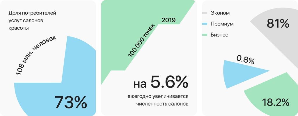 В 2019 году РБК опубликовал исследование BusinesStat по beauty-рынку в России. Согласно этому исследованию, в период с 2014 по 2018 годы доля потребителей услуг этого сегмента неуклонно росла. К началу 2019 года она составила 73,3% от всего населения России. То есть – 107,9 миллиона человек. По мнению аналитиков, на это повлияли: При этом, фактическое снижение доходов населения, которое отразилось на всех сферах, на рост этого показателя не повлияло. Изменилась лишь сегментация. Закрылось множество точек, ориентированных на средний сегмент. Но в противовес этому большую долю спроса получил сегмент эконом. По факту, их численность, несмотря на закрытия, только увеличивалась. В среднем ежегодно на 2,3% – 5,6%. К началу 2019 года их число в стране достигало почти 100 000 предприятий. Как уже было сказано, больше развития получил сегмент «эконом». Доля таких салонов составляла 81% от общего числа. «Бизнес-класс» был на отметке 18,2%, а «премиум» - всего лишь 0,8%. По-прежнему, услуг, котор