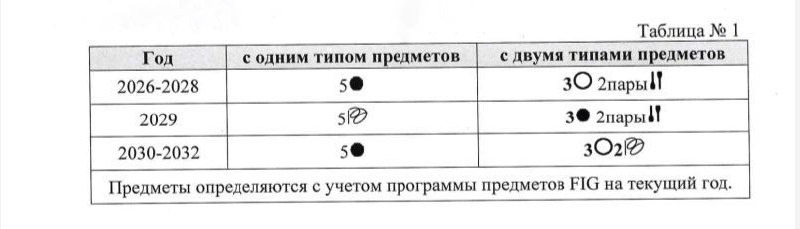 Программа для групповых упражнений которые вступают в силу с 1 января 2026 года. Программа для женщин выступающих по программе «Мастер спорта России», состоит из 2 упражнений. ➖упражнение с одним типом предмета (5) ➖упражнение с двумя типами предметов (3+2) Таблица № 1 Программа для юниорок, выступающих по программе «Кандидат в мастера спорта», состоит из 2 упражнений, каждое с одним типом предметов. ➖упражнение с одним типом предметов (5) ➖упражнение с одним типом предметов (5) Таблица № 2 Программа для девочек, выступающих по программе «I спортивного разряда», состоит из 2 упражнений, каждое с одним типом предметов: ➖упражнение с одним типом предметов (5) ➖упражнение с одним типом предметов (5) Таблица № 3 Программа для девочек, выступающих по программе «II спортивного разряда», состоит из 2 упражнений, каждое с одним типом предметов: ➖упражнение с одним типом предметов (5) ➖упражнение с одним типом предметов (5) Таблица № 4 Программа для девочек, выступающих по программе « III