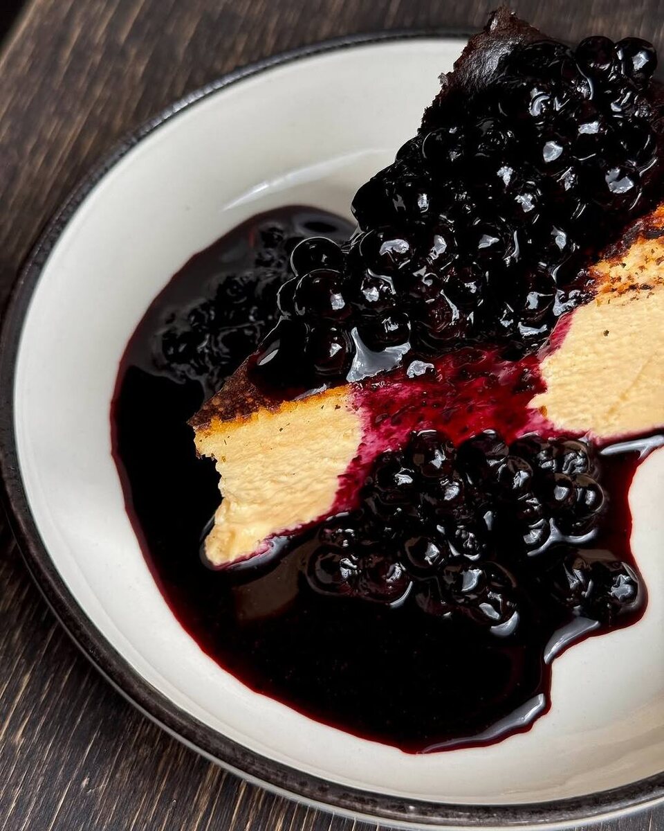 В этот дождливый день настроение поднимет баскский чизкейк из КM20, который подают с щедрой порцией черничного варенья