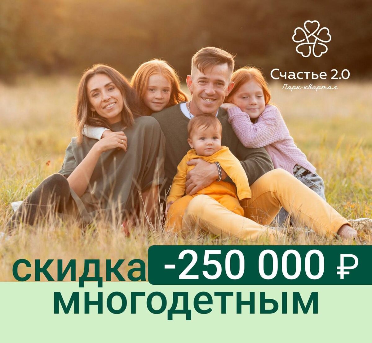 В августе стартовала новая акция, которая станет прекрасной возможностью для многодетных семей! Теперь при покупке любой квартиры вы можете воспользоваться уникальной скидкой в размере 250 000 рублей!