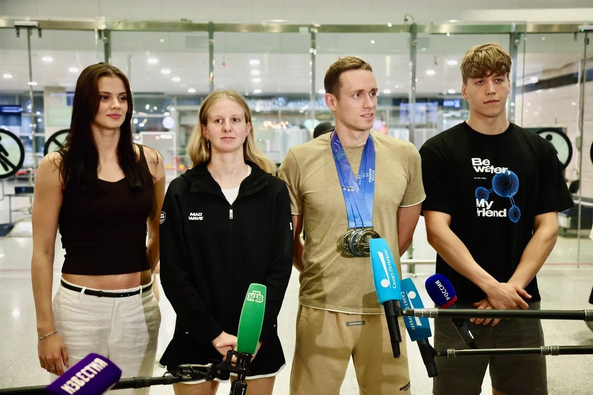 В Пулково встретили петербургских пловцов — победителей и призеров чемпионата мира по водным видам спорта в Сингапуре. Болельщики и родственники приветствовали спортсменов аплодисментами и плакатами.