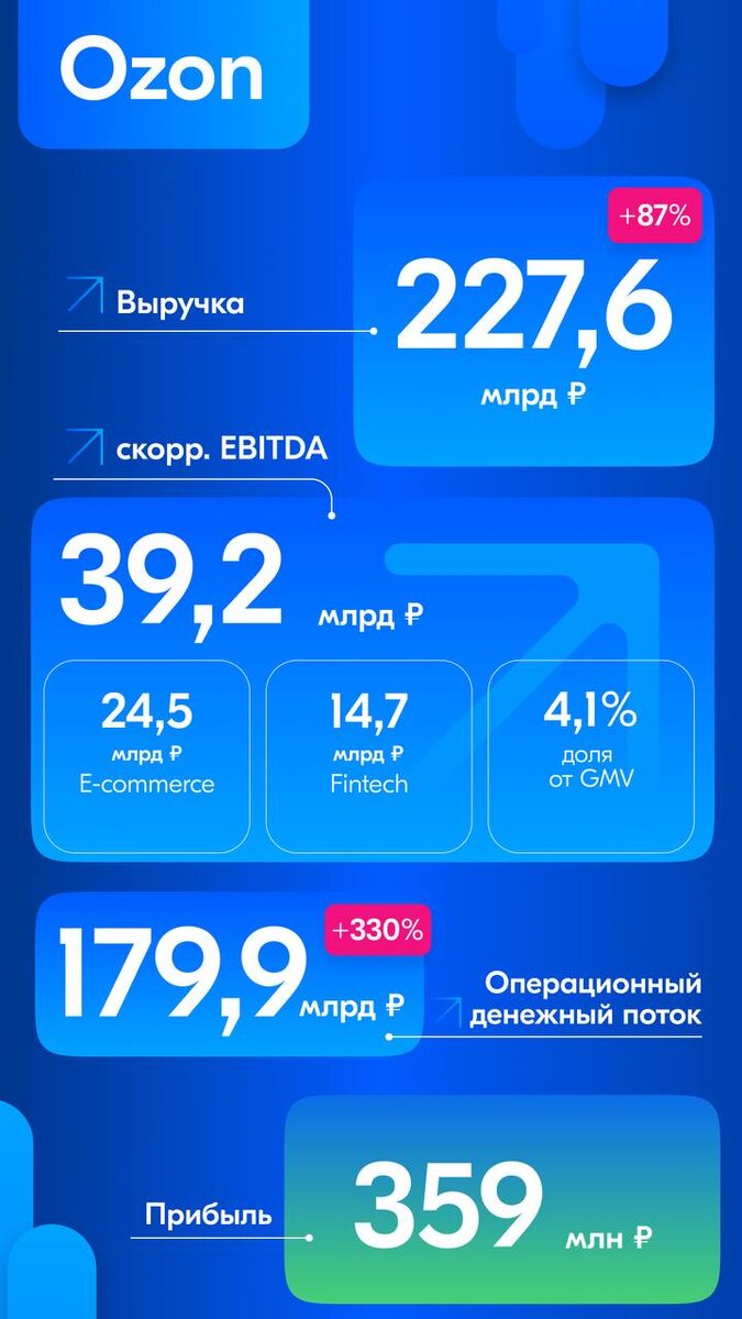 Оборот Ozon за тот же период вырос на 51%, до 958 млрд руб. Активных покупателей стало больше — уже 60 млн человек, а частотность заказов достигла 30 в год. Cкорректированный показатель EBITDA (прибыль до вычета процентов, налогов, износа и амортизации) у сегмента электронной коммерции составил 24,5 млрд руб. благодаря росту монетизации сервисов маркетплейса и снижению себестоимости логистики.
