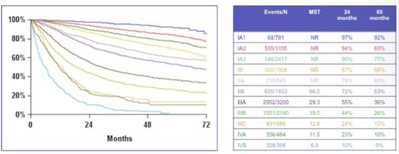 ΠΠ· ΡΠ°Π±Π»ΠΈΡΡ Π²ΠΈΠ΄Π½ΠΎ, ΡΡΠΎ Π»ΠΈΡΡ 10% ΠΏΠ°ΡΠΈΠ΅Π½ΡΠΎΠ² Ρ IVB ΡΡΠ°Π΄ΠΈΠ΅ΠΉ ΡΠ°ΠΊΠ° Π»Π΅Π³ΠΊΠΎΠ³ΠΎ ΠΆΠΈΠ²ΡΡ 24 ΠΌΠ΅ΡΡΡΠ°, Π° Π΄ΠΎ 60 ΠΌΠ΅ΡΡΡΠ΅Π² Π½Π΅ Π΄ΠΎΠΆΠΈΠ²Π°Π΅Ρ Π½ΠΈΠΊΡΠΎ. ΠΡΡΠΎΡΠ½ΠΈΠΊ: American Joint Committee on Cancer (AJCC)