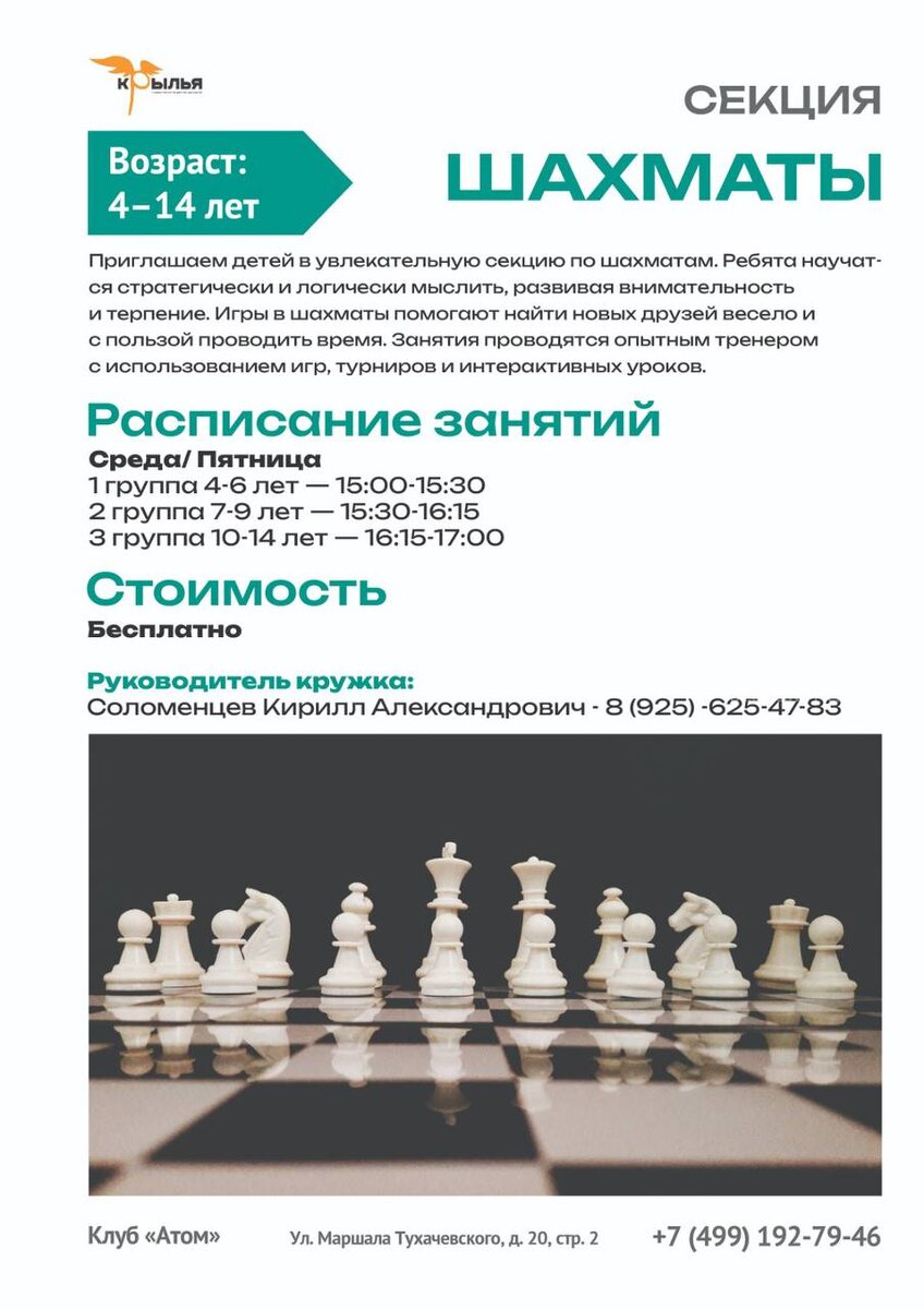 🌟 *Набираем юных шахматистов в клубе «Атом»!* 🌟 Приглашаем детей от 4 до 14 лет в нашу увлекательную секцию по шахматам! Это не просто игра — это мир стратегий, логики и безграничных возможностей! 🔹 *Почему стоит записаться?* ✅ Развиваем критическое мышление и внимательность ✅ Учимся терпению и принятию решений ✅ Находим новых друзей в атмосфере увлекательной игры ✅ Профессиональные занятия с играми, турнирами и интерактивами 📍 *Адрес:* Клуб «Атом» ул. Маршала Тухачевского, д. 20, стр. 2 📅 *Расписание:* - Среда/Пятница 👶 4–6 лет — 15:00–15:30 👧 7–9 лет — 15:30–16:15 🧒 10–14 лет — 16:15–17:00 💵 *Стоимость: Бесплатно!* 📞 *Контакты для записи:* Соломенцев Кирилл Александрович ☎️ +7 (499) 192-79-46 ☎️ 8 (925) 625-47-83 (писать в WhatsApp) _Не упустите возможность подарить ребенку полезное хобби и яркие впечатления!_ ♟️ #ШахматыДляДетей #РазвитиеМышления #БесплатныеКружки #КлубАтом #ДетскийДосуг