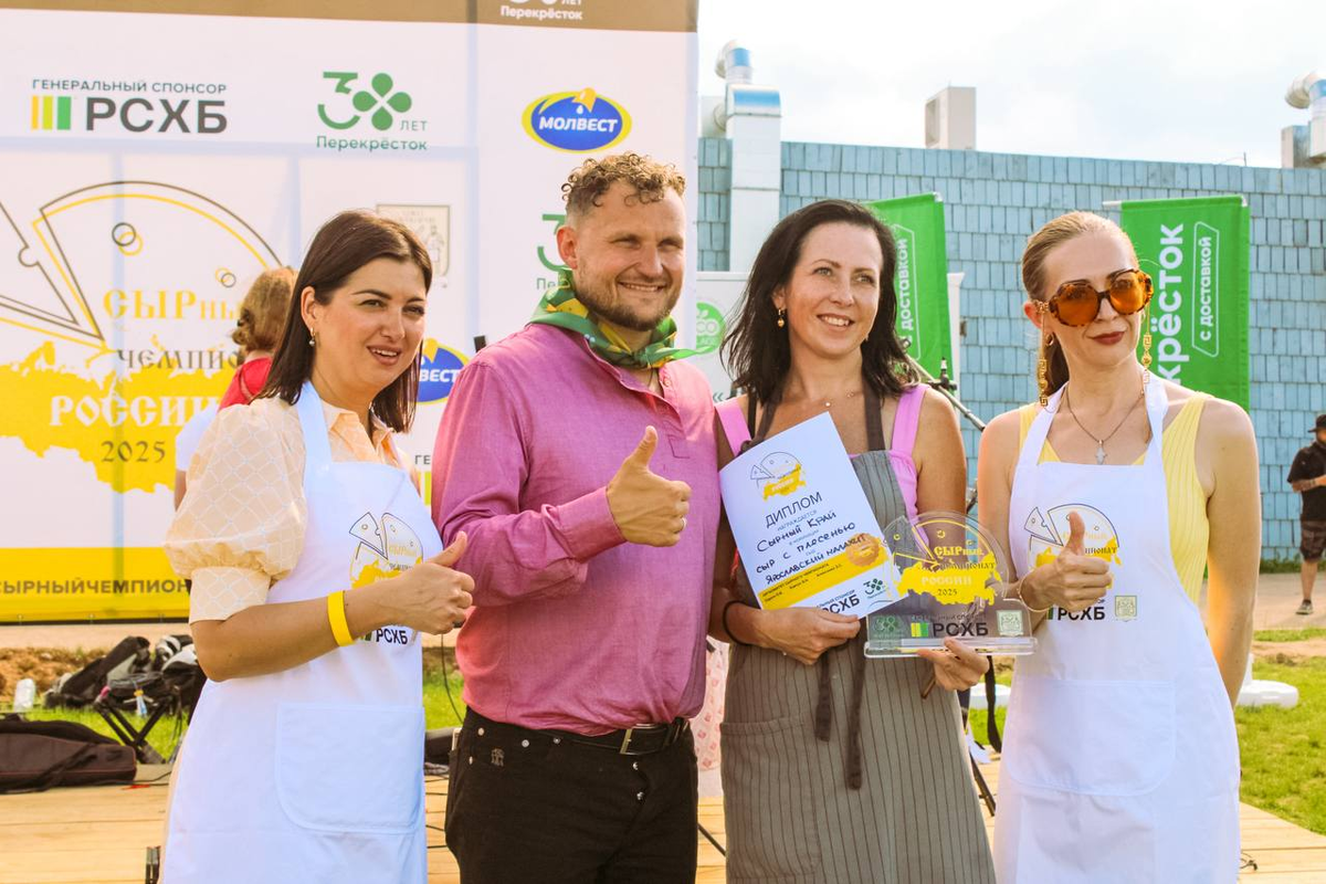 🥇 Золото выиграли: — Макарьевская сырная Артель и овечий сыр Valpecora; — ООО «Шуйское подворье» и сыр твердый «Прима Донна»; — Городецкая сыроварня и камамбер из козьего молока; — Городецкая сыроварня и их сыр «Стилтонъ»; — «Ипатов» и их мягкий козий камамбер. 🏆 Абсолютный победитель — обладатель титула «Сырный Чемпион России 2025» — «Ипатов» и их бри с трюфелем! Поздравляем всех участников! А также благодарим наших спонсоров, без которых конкурс был бы невозможен: генерального спонсора — Россельхозбанк; главного спонсора — Перекрёсток; а также Союз Сыроваров России, компании «ЭкоНива» и «Молвест».
