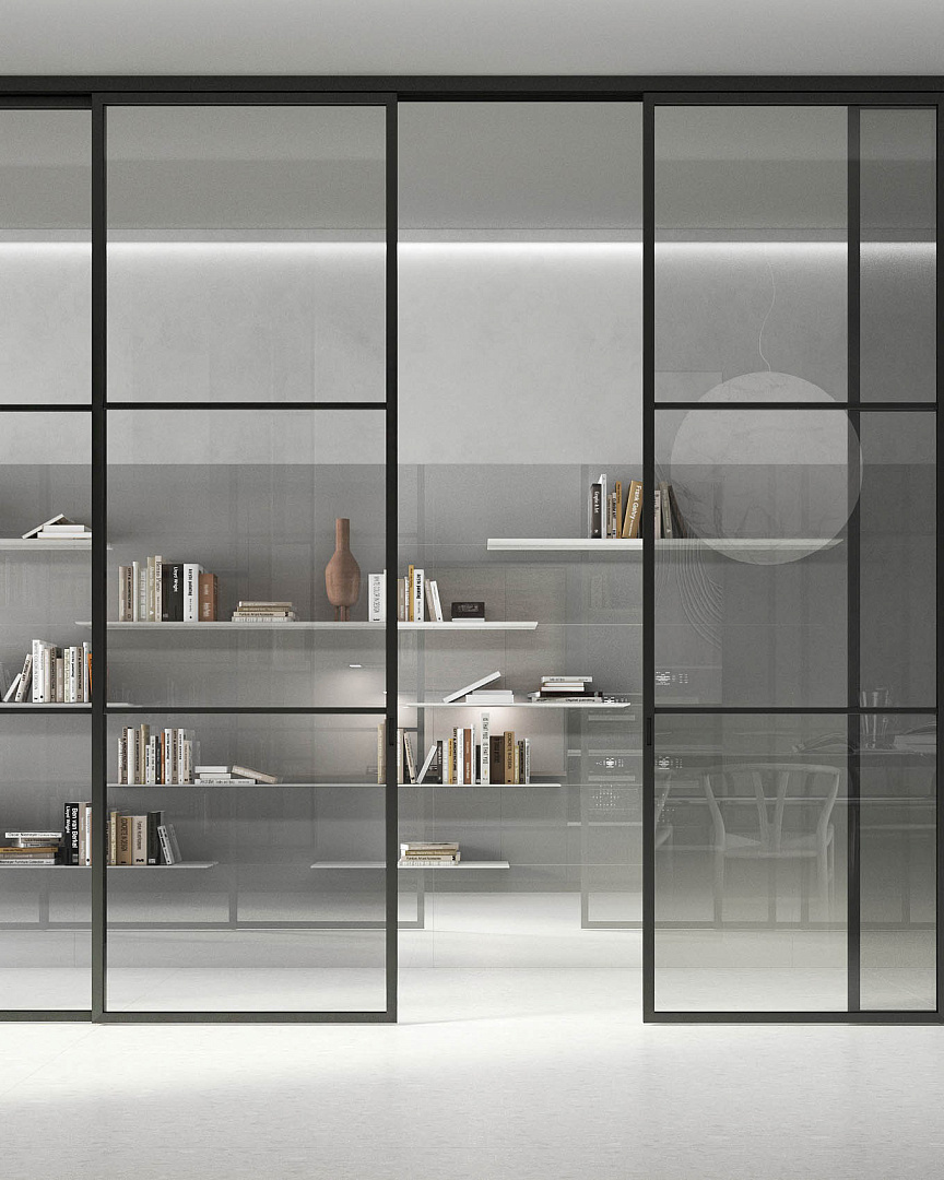 Перегородка NEO. Мы производим эту систему на собственном производстве, адаптируя её под конкретные задачи и параметры интерьера. Модель доступна в разных конфигурациях с максимальной высотой до 4000 мм и шириной полотна до 2000 мм. А при каскадной схеме движения можно легко перекрывать даже очень широкие проёмы. Толщина полотна — 45 мм, а сам механизм отличается бесшумным, сверхплавным скольжением — за счёт обновлённой системы SOFT. Полотна могут быть выполнены с различными типами остекления: прозрачное, осветлённое, матовое, тонированное, рифлёное, зеркало (в том числе тонированное), а также стекло с защитой от ультрафиолета. Алюминиевый профиль окрашивается порошковой краской, или покрывается натуральным шпоном — в зависимости от интерьерной задачи. Скрытая установка направляющих под гипсокартон делает перегородку визуально чистой и лёгкой. Благодаря конструктивной гибкости и современному дизайну, перегородка NEO гармонично впишется как в минималистичный интерьер, так и в классич