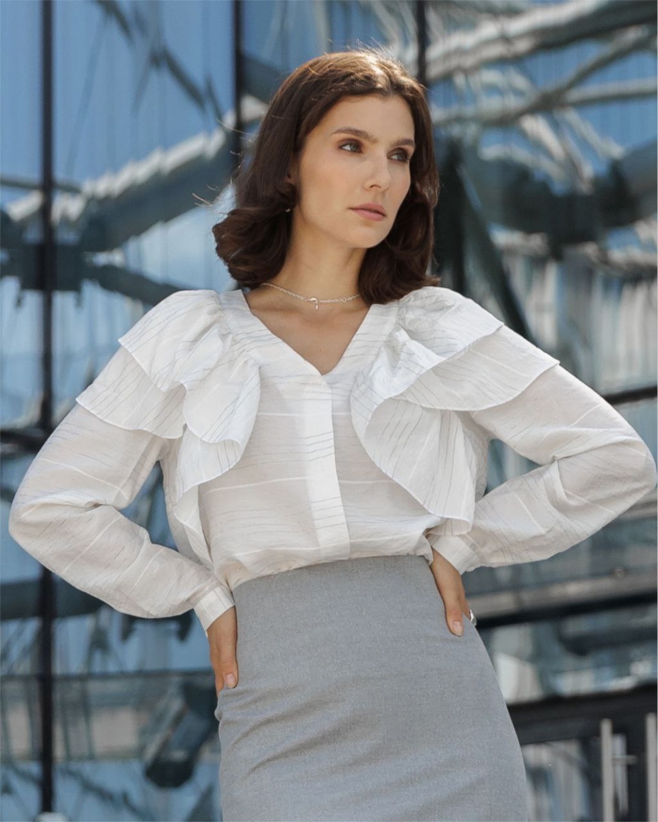 Пробуждаясь с первыми лучами солнца, почувствуйте утреннюю магию с нашей новой белой блузой Игривые воланы и деликатное серебряное мерцание придают образу нежность и изысканность. Создайте элегантный деловой стиль с классическими брюками благородного серого оттенка или утонченный женственный образ с юбкой в светло-сером оттенке, подчеркивая гармонию серебряных нитей. Прямой крой блузы позволяет носить ее свободно или заправлять, открывая безграничные возможности для создания разнообразных образов. Для заказа пишите на наш WhatsApp: https://wa.me/message/GESSL37P7LULC1