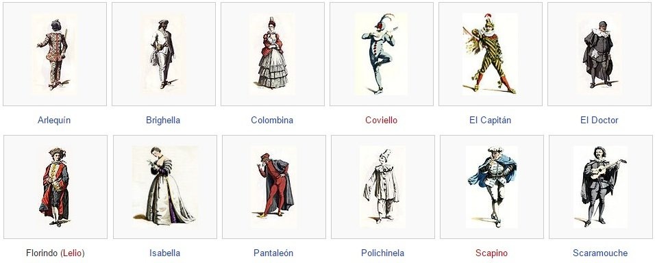 Главными персонажами комедии дель арте стали несколько классических типов. Например, Арлекин – хитрый и ловкий слуга, который часто становится главным героем и плетёт интриги; Панталоне – старый скупой купец из Венеции, жаждущий богатства и молодости; Доктор – самоуверенный и болтливый учёный или врач, часто не разбирающийся в своём деле; Капитан – хвастливый и трусливый военный; Коломбина – умная и находчивая служанка, а также безмасочные влюблённые, представляющие собой молодых романтичных героев. Эти персонажи были настолько устойчивы и узнаваемы, что их образы прочно вошли в европейскую театральную традицию.