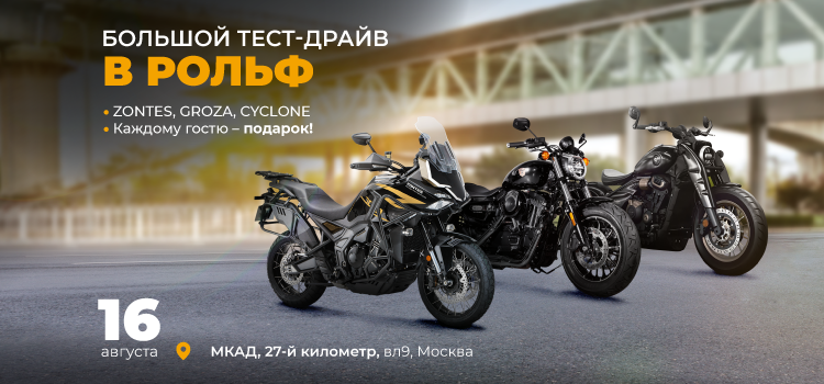 Мотоциклы среди автомобилей! Нет, это не пробка в час пик в мегаполисе. Это мотоциклы Роллинг Мото в салоне крупнейшего в России автодилера РОЛЬФ — нашего нового партнера. Теперь посетители автосалона смогут познакомиться и приобрести мототехнику дорожных брендов Cyclone, Groza, Zontes и внедорожного — KAYO. В честь начала нашего сотрудничества объявляем большой тест-драйв мотоциклов! 16 августа с 11:00 до 22:00 в автосалоне «Рольф Мегамолл Юго-Восток» по адресу Москва, 27-й километр МКАД, вл9 вы сможете лично протестировать мототехнику, сравнить модели и выбрать лучшую для себя! >>>> Обязательна зарегистрируйтесь на тест-драйв и возьмите водительское удостоверение категории «А». Экипировку выдадим! <<<< Мы выставили в РОЛЬФ хиты и новинки мотоциклов 2025 года. Мы столько о них рассказывали и наконец-то можно лично попробовать в деле турэндуро Zontes 703F, оценить стиль и эргономику уникального эдвенчер-скутера Zontes 368G и суперкомфортного максискутера Zontes 368K — наших новинок 202