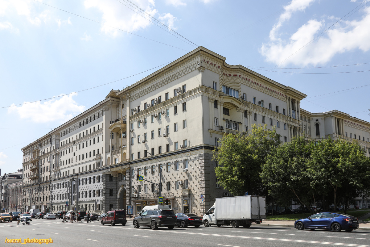 Если гулять по проспекту Мира, то сложно не заметить монументальный дом явно сталинской постройки. Могучий и стройный, он украшен богатой и разнообразной лепниной, четырехгранными «алмазными» вставками и рустованной окантовкой. И даже не с первого взгляда можно заметить, что это не один, а целых три дома, построенные друг к другу вплотную и оформленные в едином духе, с гигантской проездной аркой, ведущей во внутренний двор. Однако из всего этого строгого великолепия ярко выделяется та часть дома №11, что, как ни странно, смотрит не на проспект Мира, а в тихий уютный скверик справа. И это не просто тот нередкий случай, когда боковую часть дома язык не поворачивается назвать торцом. Полноценный фасад, в чем-то даже превосходящий своим убранством уличный, стоит ровно на том месте, что до его постройки занимала крайняя часть храма мучеников Адриана и Наталии, что в Мещанской слободе. Храму повезло уцелеть в первые годы советской власти и даже без малого двадцать лет продолжать богослужение