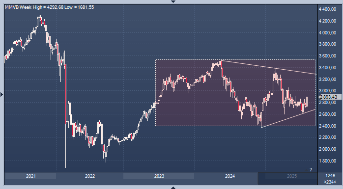 Сегодня рынок вполне может упереться в верхнюю планку, когда в стакане останутся одни покупатели. Не исключен жесткий шорт-сквиз. График индекса Мосбиржи интервалами в 1 неделю Пока мало кто может это осознать, пока космос не материализовался в котировках, но если эта встреча действительно состоится, это может стать реальным начальным шагом к окончанию украинского конфликта и ослаблению санкций против России. Трудно себе представить, что тогда будет с курсом рубля — он наконец-то упадет и вернется к своим более фундаментально оправданным уровням, думаю, и с рынком акций. А сегодня рынок вполне могут загнать под планку — лимит торгов на фьючерсах. И здесь даже бессмысленно рисовать какие-то технические уровни сопротивления. Начавшийся процесс дезинфляции включил переключатель финансового потока «депозиты — акции» в сторону фондового рынка. Если ставки и дальше будут падать, у людей появится желание рискнуть, и они часть средств, размещенных в последние годы на вкладах, направят на рынок