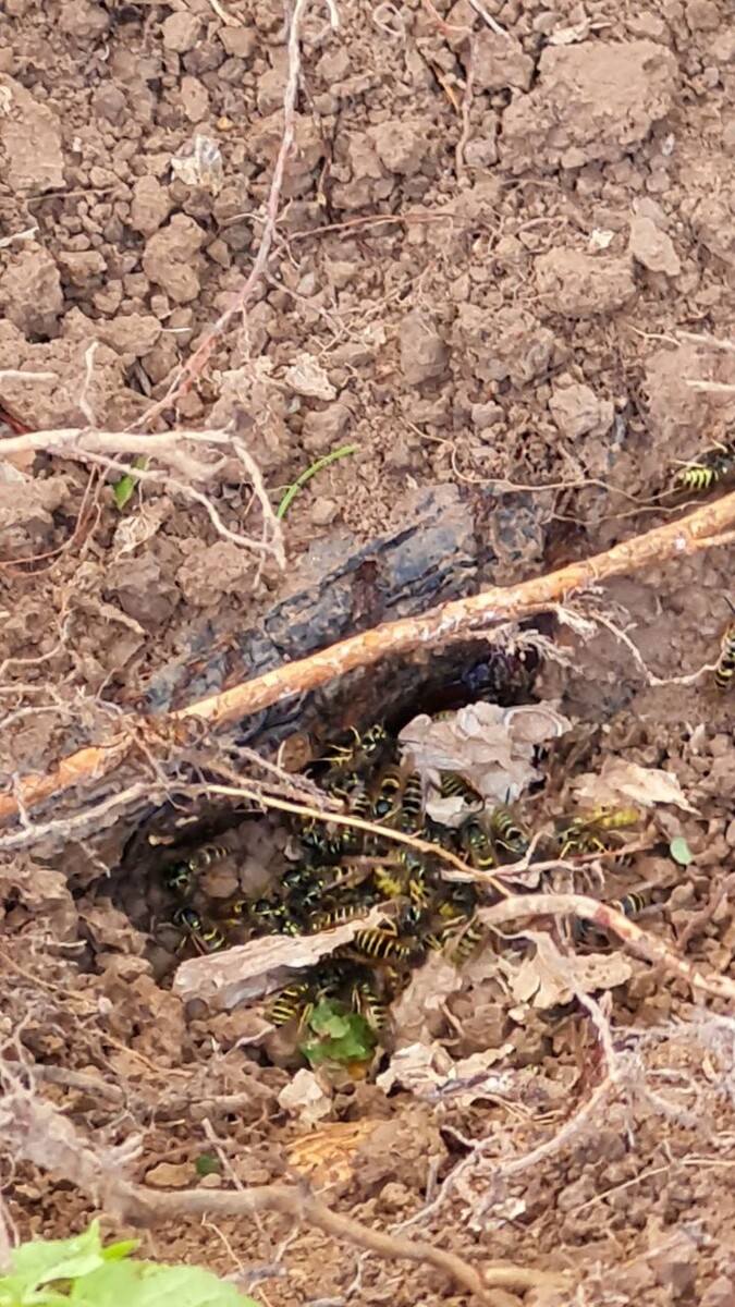 В лесу развелось много ос, строящих домики в земле. Эта семейка воспользовалась кабаньим раскопом.