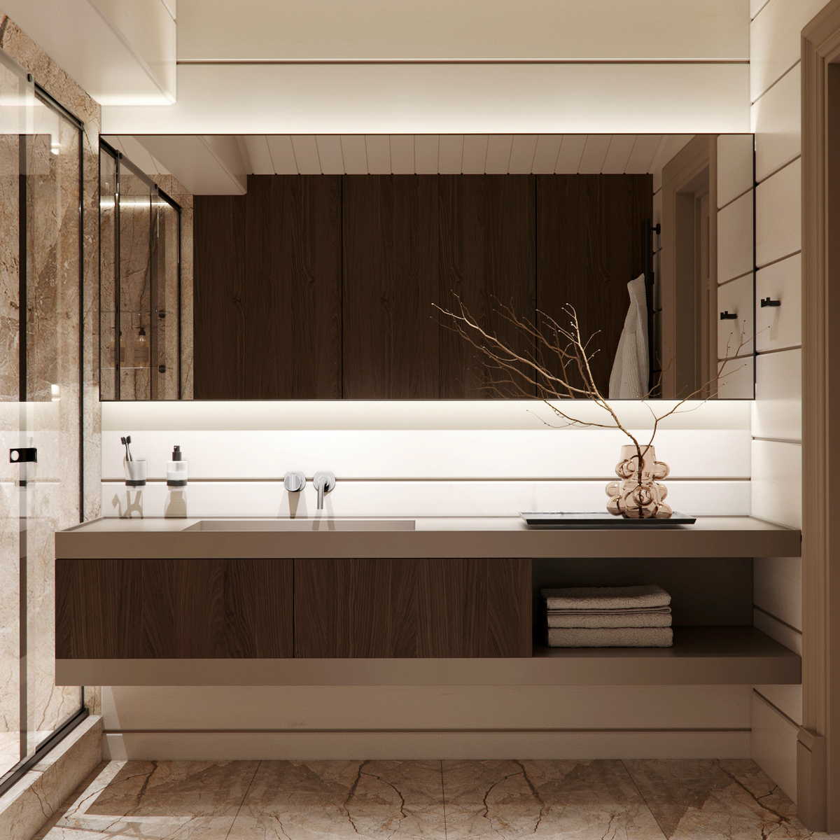 Приватный блок старшего сына выстроен как самостоятельная зона, в которой всё подчинено комфорту и логике движения. Из спальни можно пройти в гардероб — компактное, но функциональное пространство, спроектированное для ежедневного удобства. Далее — ванная комната с просторной душевой зоной. Здесь установлена стационарная душевая лейка большого диаметра, а также специальный стул, предназначенный для использования во влажных помещениях. Вдоль стены размещена столешница с раковиной и встроенной системой хранения, а в отдельной нише — инсталляция унитаза. Всё организовано так, чтобы интерьер оставался лёгким и не перегруженным, с максимальным удобством в повседневном использовании.