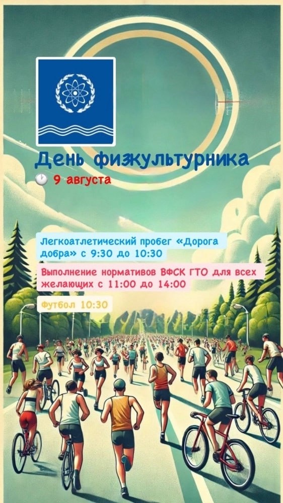 9 августа в Обнинске День физкультурника! 💪 В спортивном празднике примут участие юные футболисты и другие воспитанники СШОР "Квант". 🏃Программа откроется легкоатлетическим пробегом «Дорога добра». Сбор у спорткомплекса «Олимп» в 9:30, старт – в 10:00. ⚽️В 10:30 на стадионе «Труд» начнутся матчи любительской лиги футбола. 🏅С 11:00 до 14:00 на стадионе «Труд» любой желающий сможет сдать нормативы ГТО. Для этого необходимо предварительно зарегистрироваться на сайте www.gto.ru и привязать аккаунт к учётной записи на портале «Госуслуги». 🚴♀️Праздник завершится Атомным велопробегом, который стартует от площади возле Дома учёных в 19:00 (сбор с 17:30).