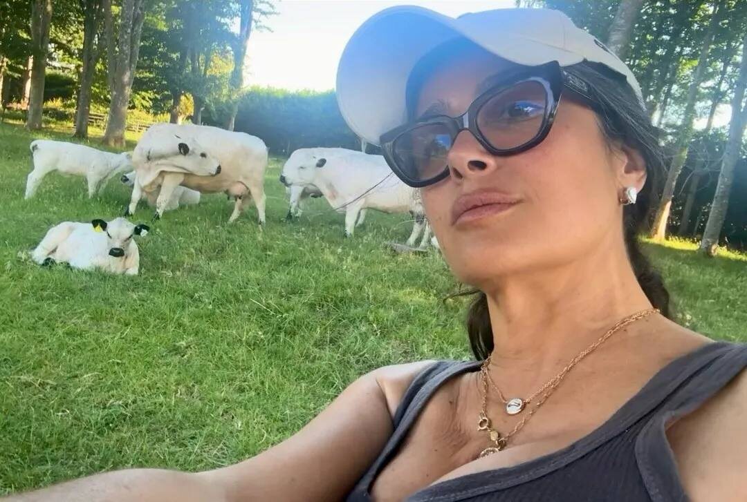 Тем временем Сальма Хайек, Кейт Мосс с дочерью Лилой и Рита Ора предаются безмятежному отдыху на ферме посреди коров