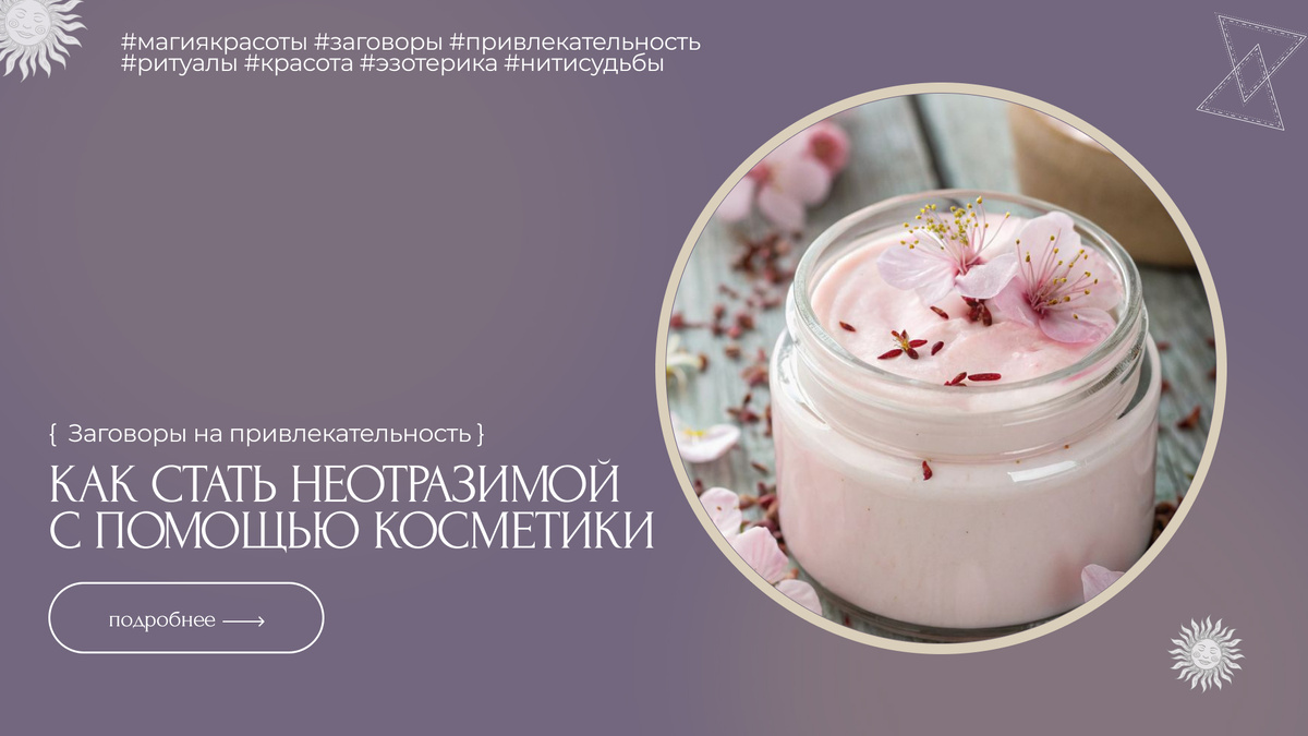 Хотите усилить свою природную красоту и привлекательность? Эти простые заговоры помогут вам наполнить вашу косметику магической силой. Читайте их в нужное время, и результат не заставит себя ждать! Читается трижды: утром, днем и вечером: "Заря купальница, солнце полуденное, румяный закат! Через силу вашу да мое живое слово вещь сия да станет источником красы. Не хилеть, не увядать, а как цвет майский расцветать телу девичьему день ото дня, час от часу. Да будет так." Читается только вечером, между 21:00 и полуночью: "От воды — чистоты, от земли — здоровья, от месяца ясного — красоты вечной. Кого зову, в помощь явитесь, да зелья сего коснитесь. Что сказано языком, то запираю замком, а ключ в море синем лежит. Да будет так." Читается три раза в любое время суток: "Три старца на пне сидели у черного океана, острова Буяна. Старцам годами моими дряхлеть, а мне волей богов молодеть. Да будет так." 🌟 Почему это работает?
