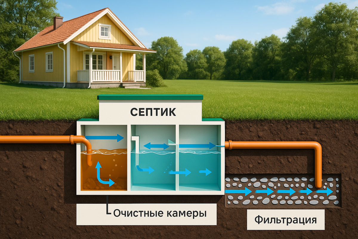 Септик — это не просто «пластиковая бочка в земле», как думают многие. Это полноценная система, которая каждый день выполняет важную и незаметную работу: очищает сточные воды от всего, что мы сливаем в раковину, душ или унитаз. Как именно это происходит? Разбираемся по шагам — простыми словами и без лишней терминологии. Когда вы моете посуду, принимаете душ или пользуетесь туалетом — вся эта вода уходит в трубы. Вместе с водой туда попадают: - бытовые отходы, - жиры и моющие средства, - органика (остатки пищи, бумаги и др.). Всё это направляется в первую камеру септика, где начинается «волшебство» очистки. В первой камере происходит первичное отстаивание. Здесь вода замедляется, и тяжёлые частицы (песок, бумага, органика) оседают на дно, образуя ил. Лёгкие примеси (жир, пенка) поднимаются вверх. Посередине остаётся условно чистая вода — именно она переходит в следующую камеру. Важно: чем больше объём септика — тем эффективнее работает этот этап. Маленький септик может не успеть "от
