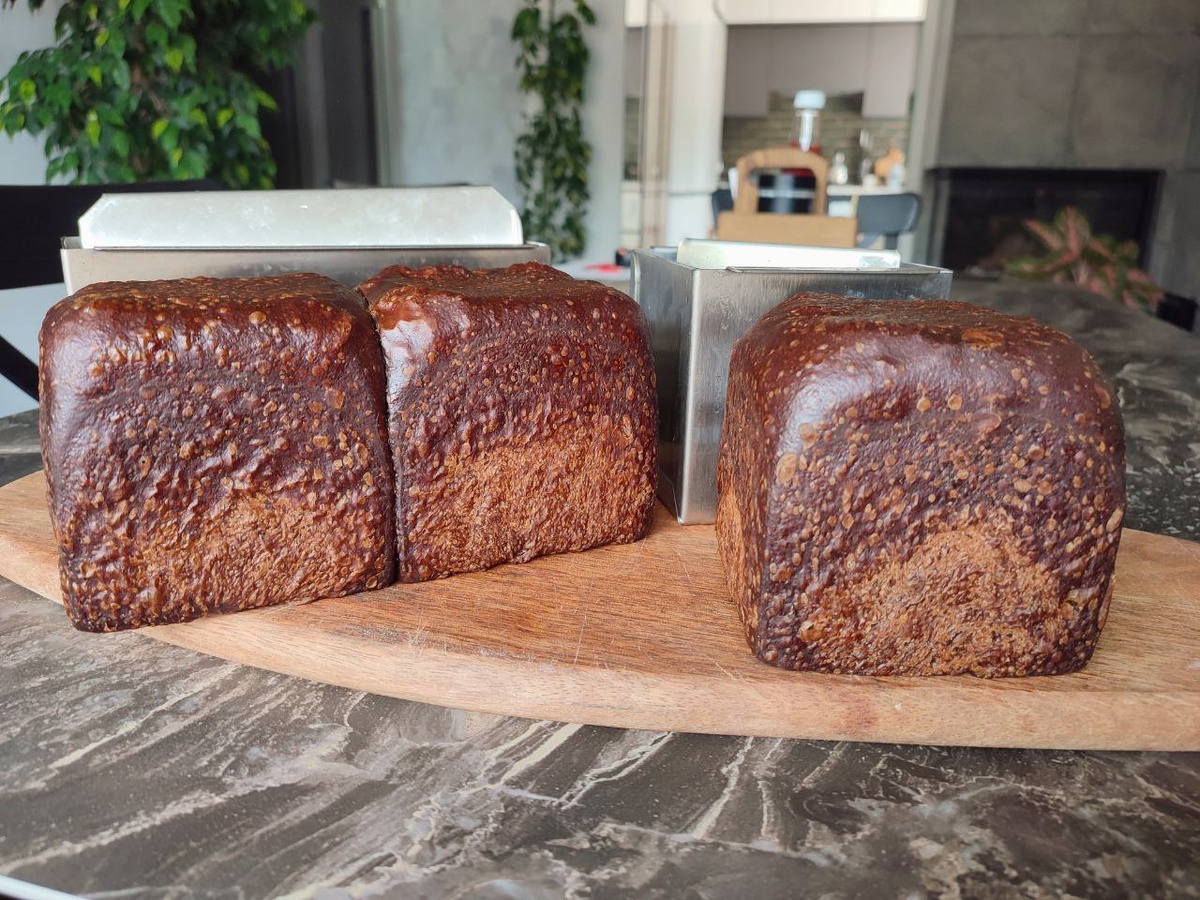 Про муки творчества. #расскажуисторию Наверное вы думаете, что у меня с выпечкой всегда все четко и по плану? Но нет... Как раз обычно, все наоборот! Мысль возникает внезапно, а дальше уже рукам только успевай... Вот вчера. Стояла моя новая закваска на абрикосах и подмигивала мне своими радужными пузырями. Как бы намекая, что пора кормиться и чего-то уже замутить, а то банка тесная, а хочется свободы и экспрессии🤣 Первая мысль была про булки и сдобу, но душа не поддержала😃 И тут, да! Оно! "Черный бархат", конечно! Наливаю воду, добавляю мед, масло, солод. Думаю, какую взять муку? Рука потянулась к Твердохлеб 1 сорт. Сыплю. Думаю: она же влагоемкая. Значит либо ещё воды, либо муки поменьше. Соль ещё не сыпала... Значит меньше муки! Замешано! Мысль работает дальше! Мы тут собрались в поездку по окрестностям. А в дорогу удобно тостовый хлеб! Решено! Буду печь в тостовой форме! Но! На одну теста много. А на 1 большую + 1 маленькую вроде маловато... Эхх! Надо было все же больше м