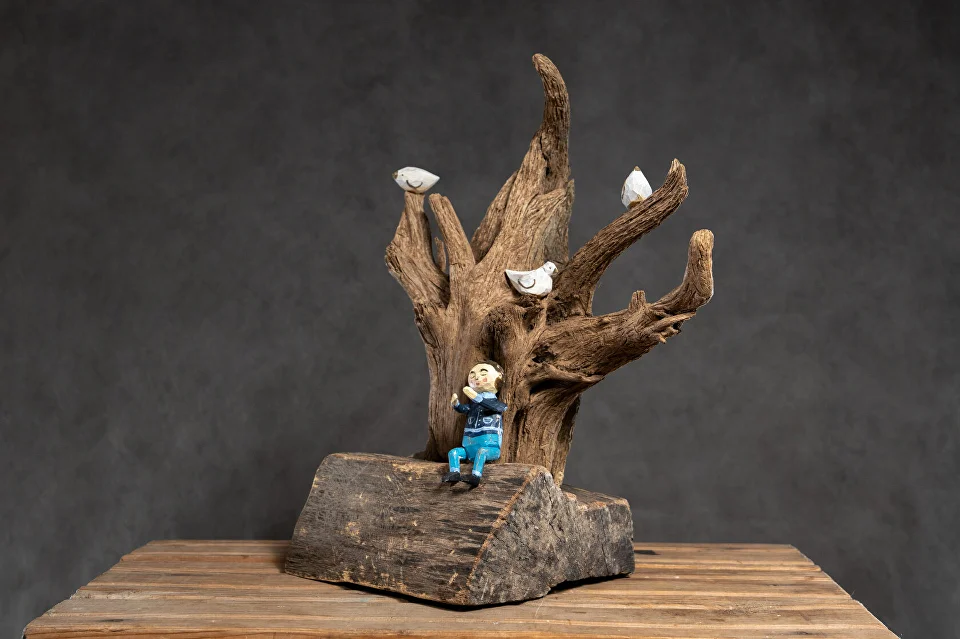 Мне нравится работать с деревом, особенно с предметами, прожившими свою жизнь. Я даю им второе дыхание, превращая в произведения искусства. У меня есть работа «Хранитель вод». Чтобы появилась вся композиция, потребовалось около пяти лет. Первый этап: из старой огуречной бочки родилась лодка. Второй этап: вырезала из липы хранителя. Год он сидел «голым», пока на чердаке у тёти я не нашла мешок с тканями моей прабабушки — так появилась одежда. Одних только шляп было три варианта! Завершающий этап: светильник — воронку для сбора берёзового сока нашла в лесу. Так что у Хранителя своя история...