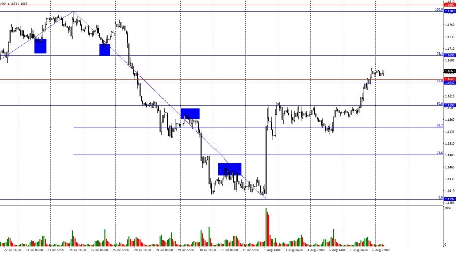 https://basechop.ru/wordpress/?p=52998 Добрый день, уважаемые трейдеры! Пара EUR/USD в среду продолжала процесс роста и выполнила закрепление над зоной сопротивления 1,1637–1,1645. Европейская валюта продолжает быстро восстанавливаться после месячного падения, и на это имеются все необходимые причины. Таким образом, процесс роста может быть продолжен сегодня в направлении уровня коррекции 76,4% – 1,1695. А закрепление над ним позволит рассчитывать на рост в направлении зоны сопротивления 1,1789–1,1802. Ситуация с волнами на часовом графике остается простой и понятной. Последняя завершенная волна вверх пробила пик предыдущей волны, а последняя волна вниз пробила предыдущий лоу. Таким образом, в данное время тренд можно считать «медвежьим», но в последнее время он слишком часто меняется из-за информационного фона. Дональд Трамп сумел подписать несколько выгодных сделок, что придало сил медведям, как и заявления Джерома Пауэлла после очередного заседания ФРС. Однако последние данные по…
