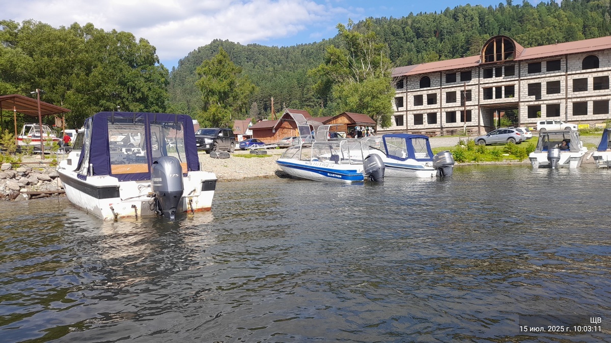 Проплывали всякие базы. Это вроде Алтай Вилла. До нее есть дорога по суше. Плохая. Но есть. До остальных,которые дальше будут, дорог по суше нет. Только по воде туда попадать и на вертолете...