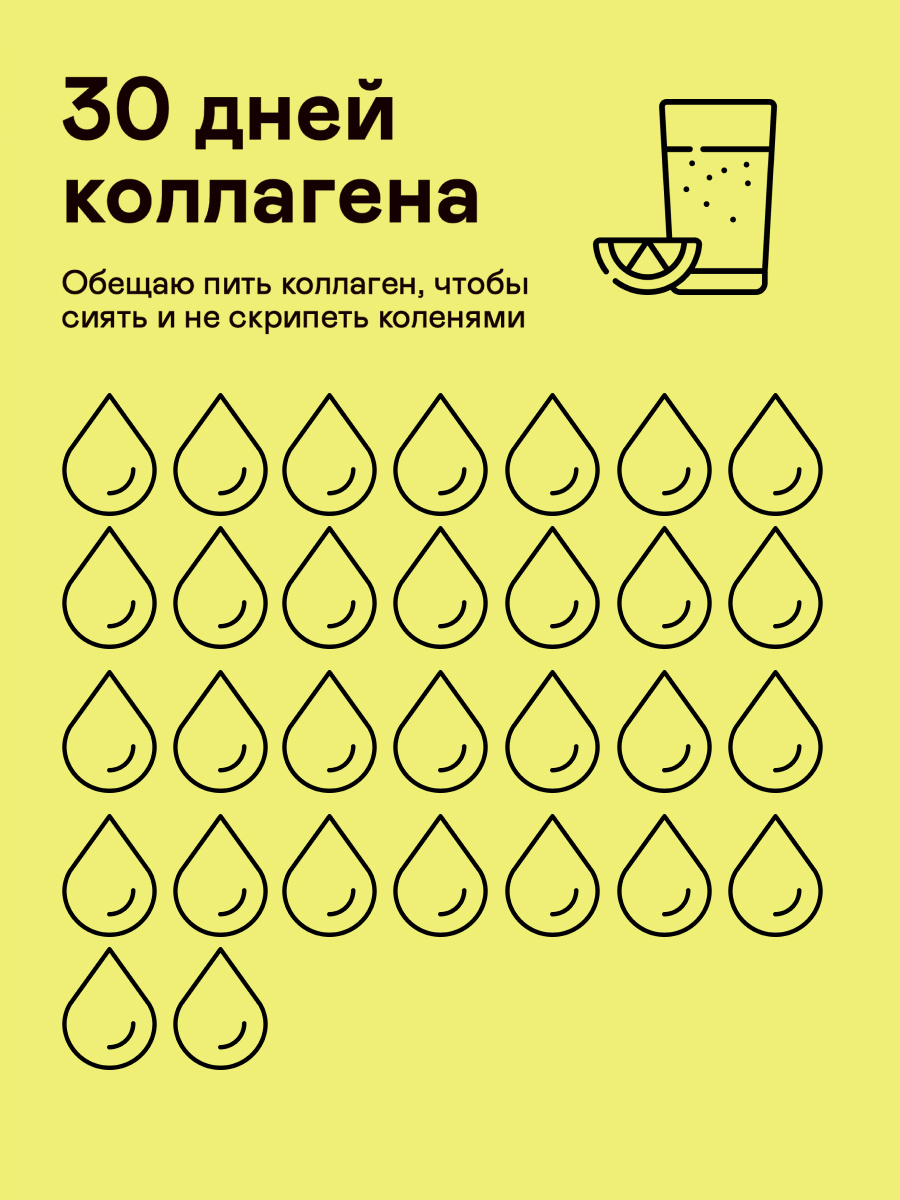Его можно скачать, распечатать и каждый день отмечать — выпили ли сегодня коллаген. Это отличный способ сформировать полезную привычку — и делать это с удовольствием Важно помнить: коллаген — это не "таблетка молодости", а поддержка организма изнутри. Он работает лучше всего в тандеме с питанием, сном, водой и движением.