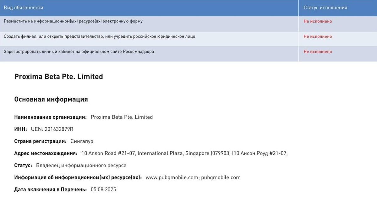 Издателя PUBG Mobile обязали открыть офис в России и зарегаться в Роскомнадзоре Proxima Beta должны завести представительство в России, получить регу в РКН и указать всю нужную информацию на своём сайте Если этого не сделать, то будут санкции — запрет рекламы, исчезновение из поисковиков или же полная блокировка В 2023 году компанию Proxima Beta внесли в реестр организаторов распространения информации, а потом штрафанули за отказ перенести данные в Россию @imaxai Подписаться