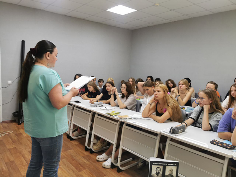 Сотрудники Рязанской областной универсальной научной библиотеки имени Горького посетили Центр одарённых детей «Гелиос». Для участников смены, выбравших литературное направление, Наталия Королёва — режиссёр, драматург и прозаик, руководитель любительского театра «Атмосфера» при библиотеке имени Горького и автор произведения — провела читку рассказа «Как друг пятиклассника Васьки на СВО ушёл». Встреча началась с показа музыкального клипа на песню Павла Русского «Домой», включающего документальные кадры из зоны Специальной военной операции. Павел не раз выступал с концертами перед бойцами и участвовал в доставке гуманитарной помощи. Наталия поделилась с детьми и подростками секретами писательского мастерства, рассказала о работе современных литературных сообществ, творческих и профессиональных союзов. Участники смогли задать автору интересующие их вопросы о современной литературной среде. Особое внимание было уделено теме патриотического воспитания детей и молодёжи через художественное сл