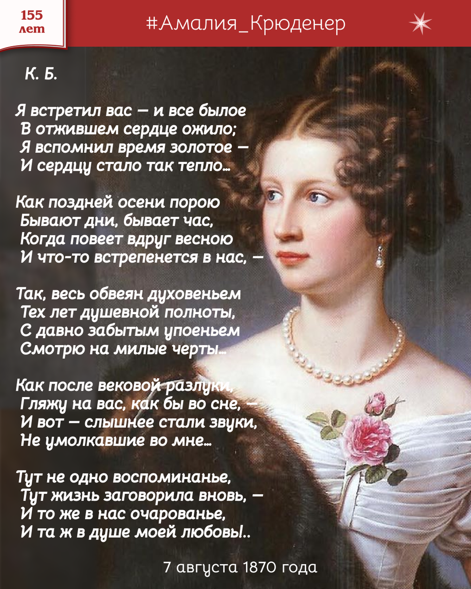 В 1825 году красавица Амалия стала женой первого секретаря русского посольства в Мюнхене барона Крюденера. Это стало большим ударом для поэта. В 1826 году Федор Тютчев женился на Элеоноре Петерсон.