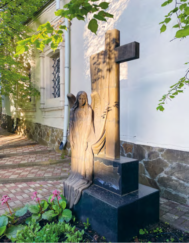 Пройдя несколько шагов вперед, можно видеть бронзовую скульптуру ангела, стоящего у Креста. Памятник установлен в 2010 году на месте захоронения костей, найденных здесь при восстановлении территории: говорят, здесь массово расстреливали людей. «Скорбящий ангел приоткрывает драпировку, наброшенную на крест, — это символическое изображение раскрытия тайны, покрывшей репрессии тридцатых годов, — говорит архитектор Леонид Горник, активно участвующий в деле восстановления и благоустройства храма и его территории. — Слезы у ангела — это слезы скорби не по самим жертвам (они уже в Царстве Небесном), а печаль о тех, кто творил злодеяния».