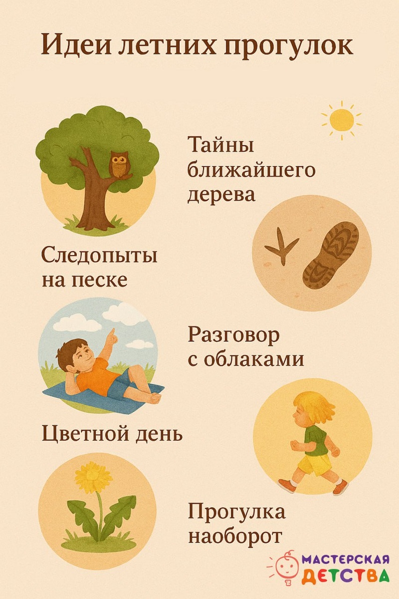 ☺️ Летняя прогулка — больше, чем просто «вышли на улицу». Это возможность развивать речь, наблюдательность, воображение, моторику — в самой естественной среде. А чтобы неделя прошла ярко и с пользой, ловите подборку идей для прогулок с детьми: 1️⃣ «Тайны ближайшего дерева» Выберите дерево на участке. Наблюдайте: кто на нём живёт? Какие листья? Какой цвет коры? Что можно услышать рядом? Запишите «открытия» в мини-дневник группы. 2️⃣ «Следопыты на песке» Утром или после дождя понаблюдайте за следами — чьи они? Куда вели? Можно устроить игру: «Найди чей след». 3️⃣ «Разговор с облаками» Просто лечь на плед и смотреть в небо — это уже развитие воображения. Обсудите, на что похожи облака. А потом нарисуйте увиденное мелками. 4️⃣ «Цветной день» Выбираете цвет (например, жёлтый) — и ищете на участке всё, что его содержит. Это и внимание, и словарь, и радость от находок. 5️⃣ «Прогулка наоборот» Измените привычный маршрут: идите задом наперёд, по спирали, зигзагами. Меняем восприятие простр