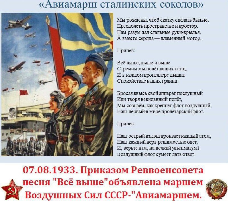 7 августа 1933 года приказом Реввоенсовета песню "Все выше" объявили маршем ВВС СССР - "Авиамаршем".