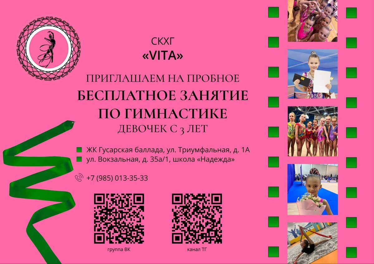 ✨ СКХГ «VITA» – твой путь к грации и чемпионству! 💖 Набираем девочек от 3 лет в группы художественной гимнастики! 🏆 Почему мы? ✔️ Набор ведет тренер высшей категории Новойдарская Виолетта ✔️ Гармоничное развитие: гибкость, сила, артистизм ✔️ Участие в соревнованиях и показательных выступлениях ✔️ Удобные залы в двух локациях 📍Адреса залов: Одинцово • ул. Вокзальная, 35А/1 • ЖК Гусарская баллада ул Триумфальная 1А 📲 Запись по телефону: +79850133533 или в личку t.me/violetta_rg 🔥 Спорт. Грация. Успех. Стань частью нашей команды! #ХудожественнаяГимнастика #VITAчемпионы #ГимнастикаДляДетей #СпортДляДевочек