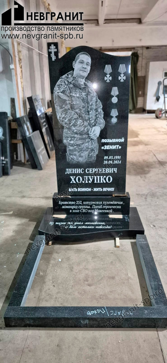 На фотографии представлен монументальный памятник, посвященный Денису Сергеевичу Холупко (09.03.1991 - 20.06.2024), павшему герою. Этот памятник, выполненный из черного гранита, является выражением глубокого уважения и скорби. Он сочетает в себе традиционные элементы и современные техники, чтобы увековечить память о павшем воине. Дизайн и Композиция: Памятник состоит из нескольких ярусов, каждый из которых несет свою смысловую нагрузку: • Верхняя Стела: Выполненная из черного гранита, стела имеет слегка закругленную форму. На ней выгравированы: • Христианский крест. • Портрет Дениса Сергеевича в камуфляжной форме. • Изображения наград. • Позывной "Зенит". • Даты жизни (09.03.1991 - 20.06.2024). • Имя, отчество и фамилия. • Девиз: "Быть воином - жить вечно!". Средняя Стела (Подставка): Под верхним блоком расположена горизонтальная стела меньшего размера с надписью: "Братство 252, штурмовик пулемётчик, командир группы. Погиб героически в зоне СВО под Макеевкой." • Нижняя Ст