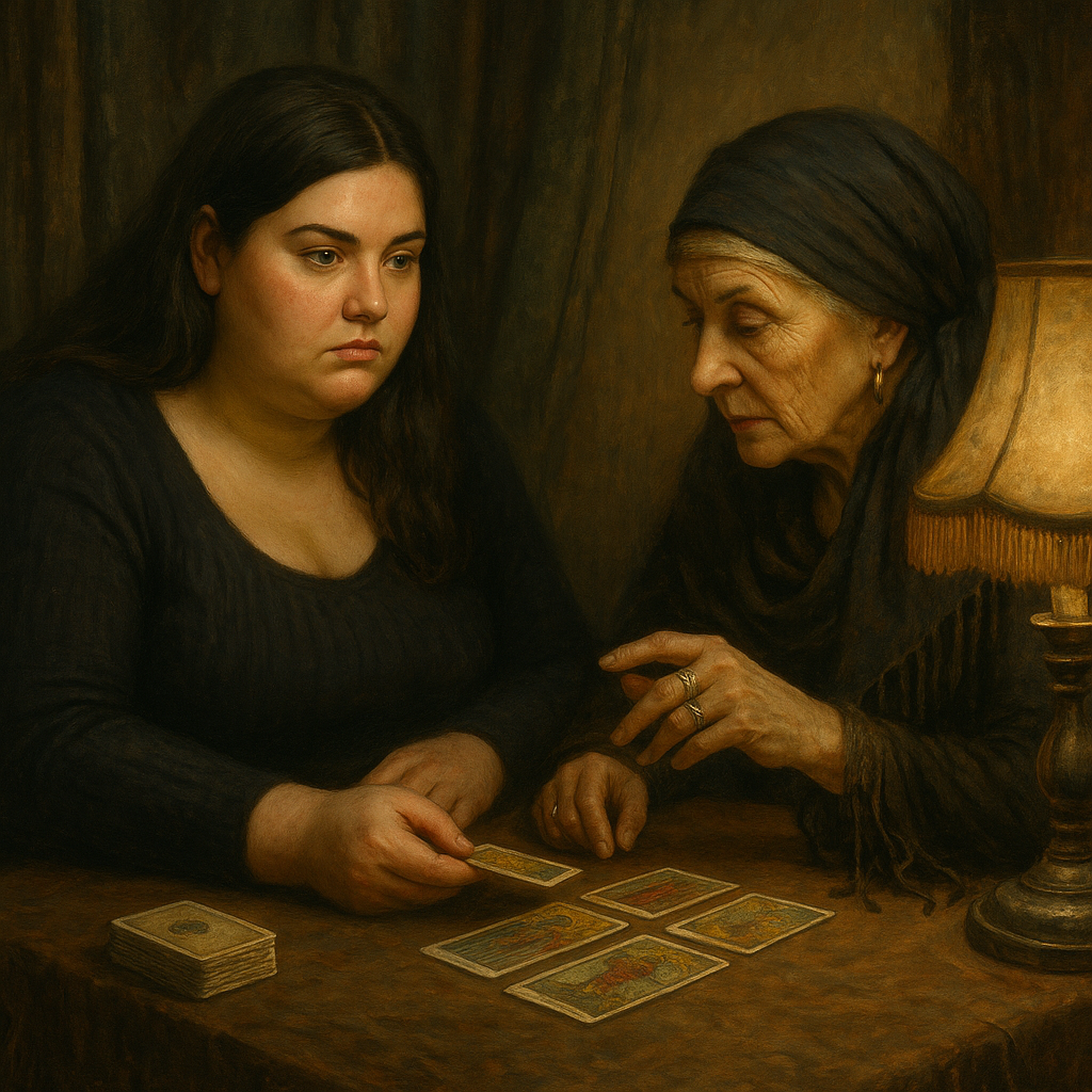 Внутри пахло ладаном и пылью. Маленькая комната, занавешенное окно, старая лампа с бахромой. За столом — женщина лет под шестьдесят, в чёрной шали и с серебряными кольцами. Волосы — в пучке, губы — тонкие, будто обиженные на жизнь.