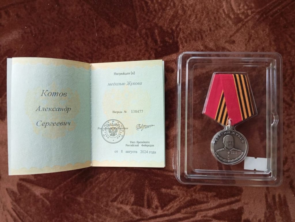 Указом Президента Российской Федерации от 8 августа 2024 года Александр Сергеевич Котов был удостоен медали Жукова. Это одна из государственных наград, которую вручают за особые заслуги перед страной. Александр Котов, боец СВО, о котором «Знаменка» писала в декабре 2024 года в статье «Высшая награда Александра Котова», прислал нам видео. И написал: «На момент интервью меня удостоили государственной награды. Узнал я об этом почти через 300 дней, а получил недавно». На тот момент, когда мы брали интервью у бойца, он уже трижды воевал по контракту в зоне СВО в составе спецназа «Ахмат». Был командиром штурмовой группы, имеет ранения. А в перерывах между контрактами вместе с супругой Анной заливали окопные свечи. Если бы не травма, сказал тогда Александр, я бы давно был на фронте. Они залили более 17 тысяч окопных свечей! Собирали для бойцов гуманитарную помощь. А еще он проводил в школах мастер-классы для ребят. И вот Александр сообщил, что он опять в зоне боевых действий с 2 июня, в соста